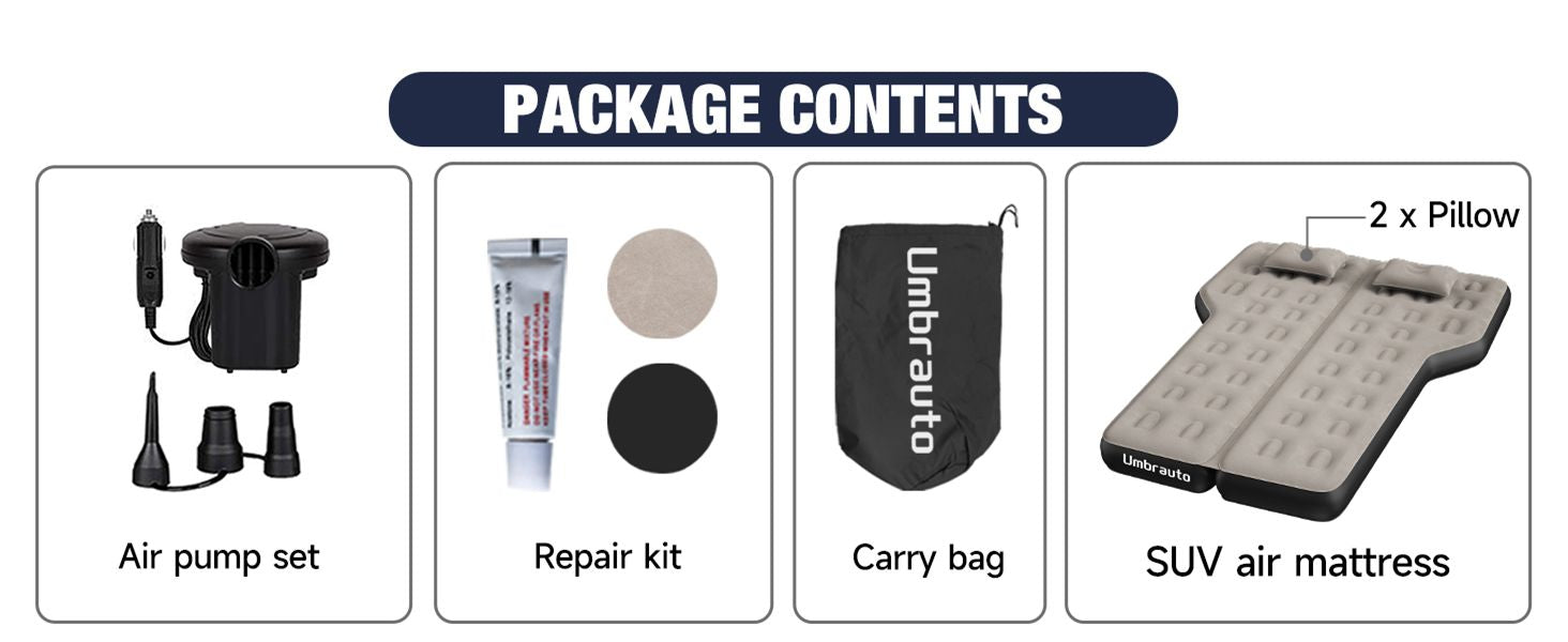 - Abundant Accessories: The Umbrauto car camping mattress includes an electric car air pump, a 3-meter power cable for connecting to the car's cigarette lighter socket, several handy repair patches, and a convenient storage bag.