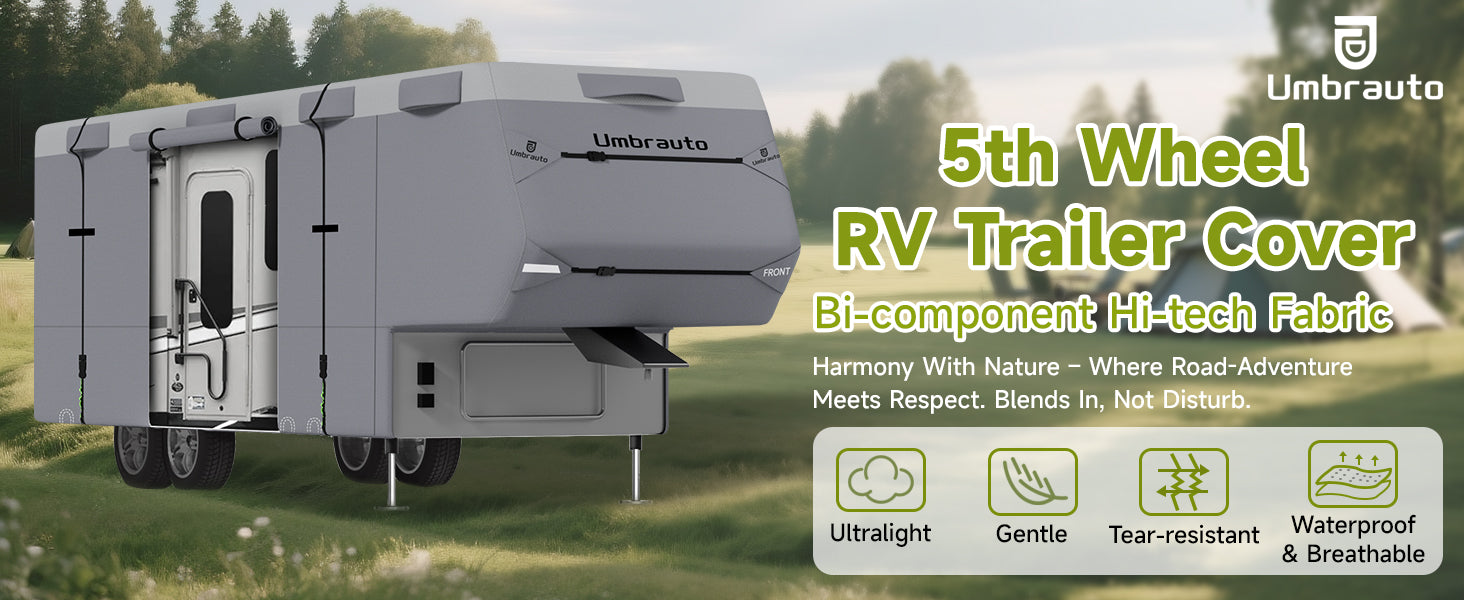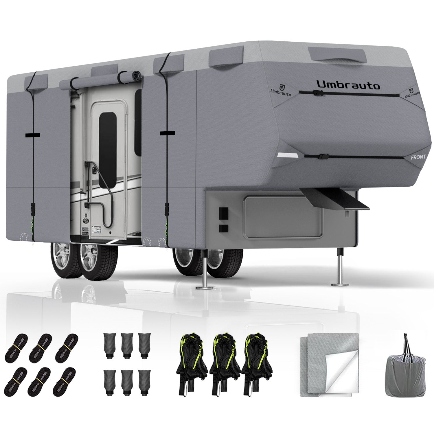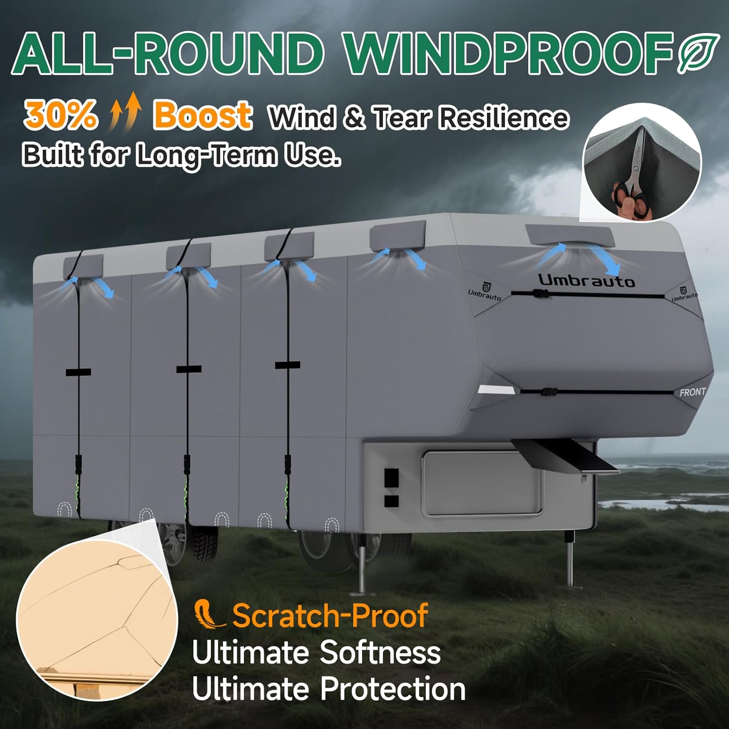 Keep your 5th wheel or travel trailer looking new year-round. Built from a 7-layer premium top panel with reinforced corners and windproof straps, this cover shields against sun, rain, snow, dust and scratches while letting trapped moisture escape — so your rig stays dry, ventilated and protected.