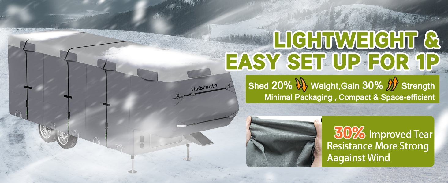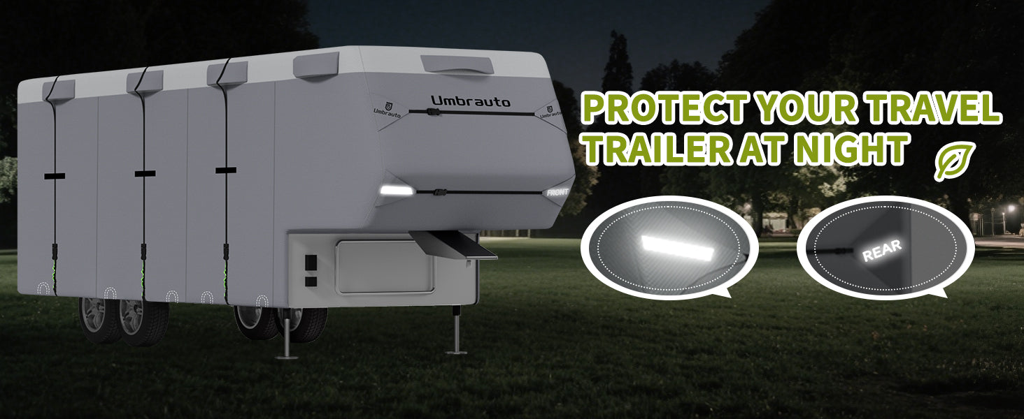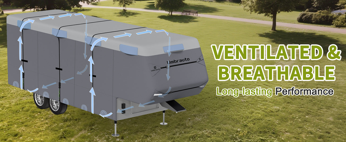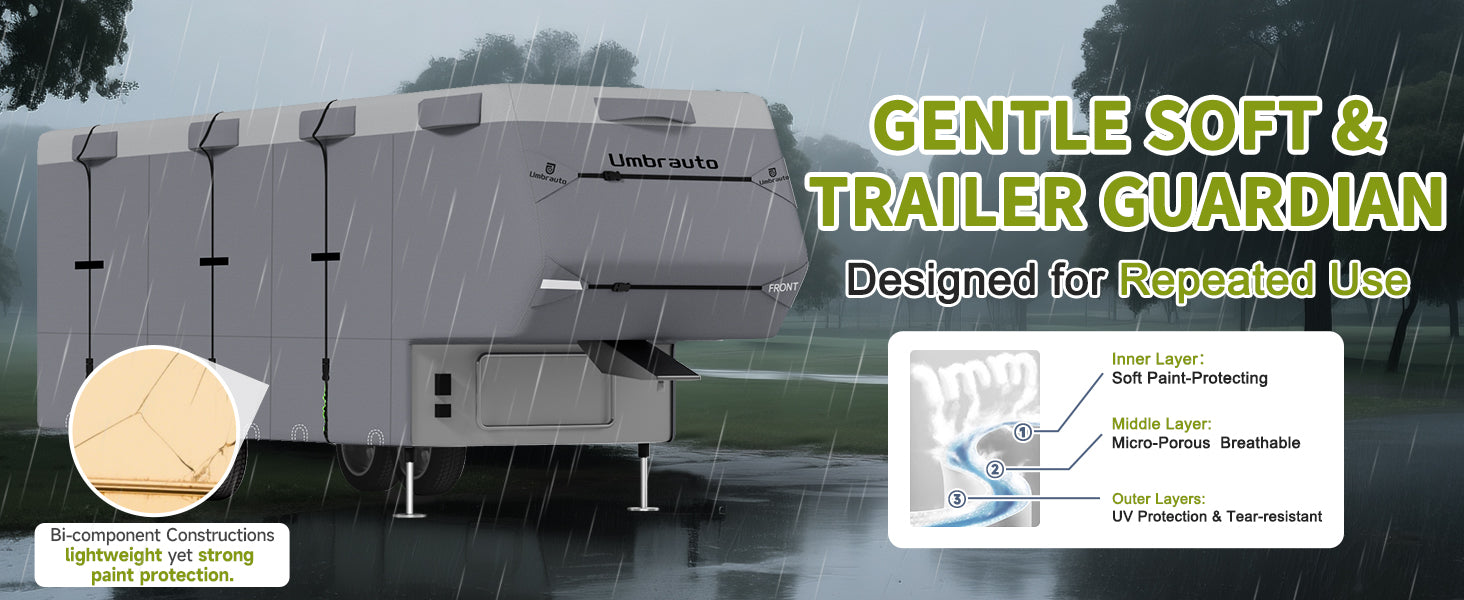 Keep your 5th wheel or travel trailer looking new year-round. Built from a 7-layer premium top panel with reinforced corners and windproof straps, this cover shields against sun, rain, snow, dust and scratches while letting trapped moisture escape — so your rig stays dry, ventilated and protected.