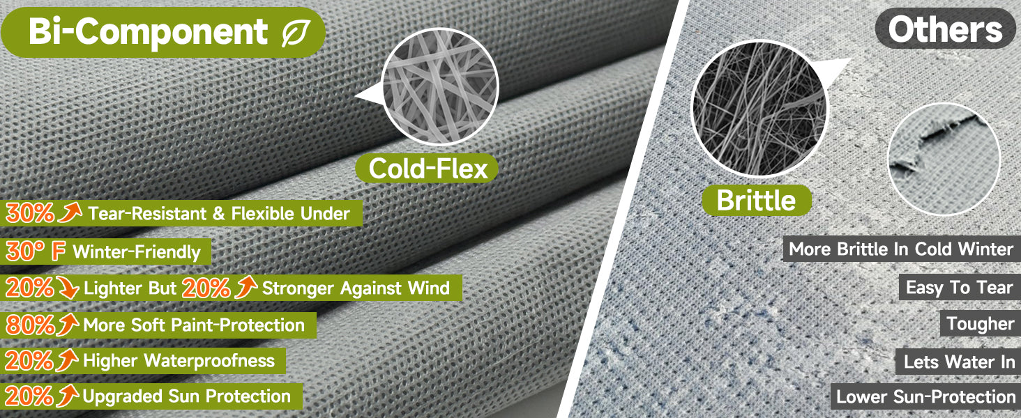 The cover blends a waterproof outer layer with strategically placed vents so rain stays out while humidity vents away — protecting paint, decals, seals and trim. Repositioned tension panels distribute force across the cover (not at a single point), and extra straps and reinforced corners help the cover stay secure in stronger winds.