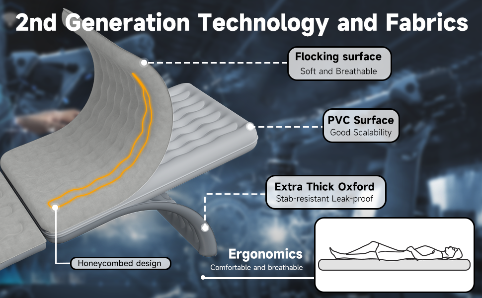 - Premium Material: Our air mattress features thickened PVC fabric, ensuring exceptional durability and leak-proof performance. Enhanced with a plush velvety surface, it offers a comfortable touch and maintains waterproof quality. Whether for outdoor camping or indoor use, it provides reliable comfort and peace of mind.