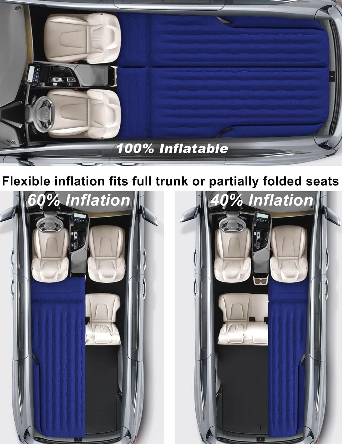 - Easy Inflation/Deflation: Our electric car pump inflates and deflates the car mattress within minutes. Inflate the mattress fully for multiple people or partially (40% or 60%) for a single person, whichever suits the back space of your SUV best.