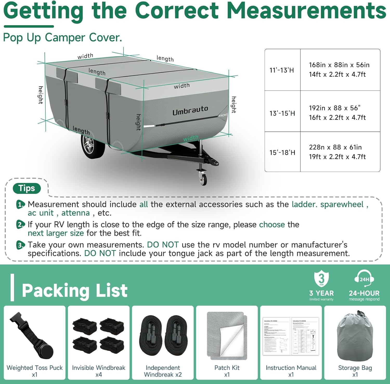- 1 × Umbrauto Pop-Up Camper Cover (4.7 ft / 56" Extra-High Wall)