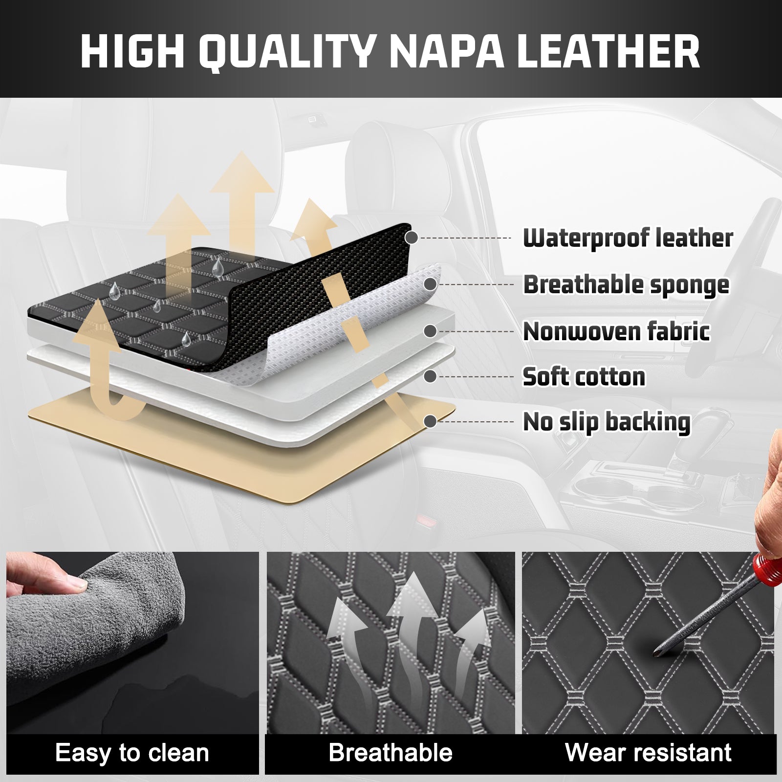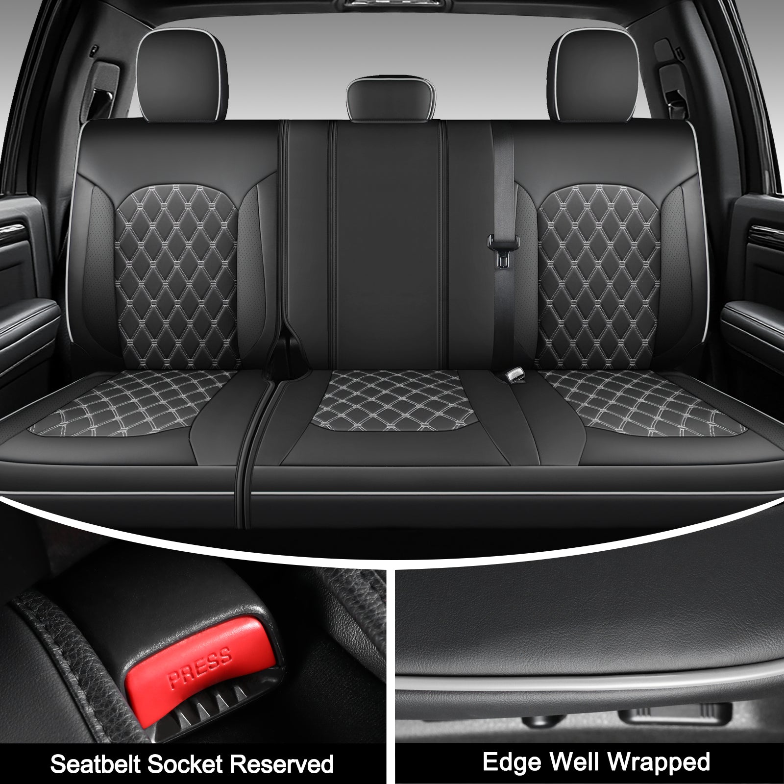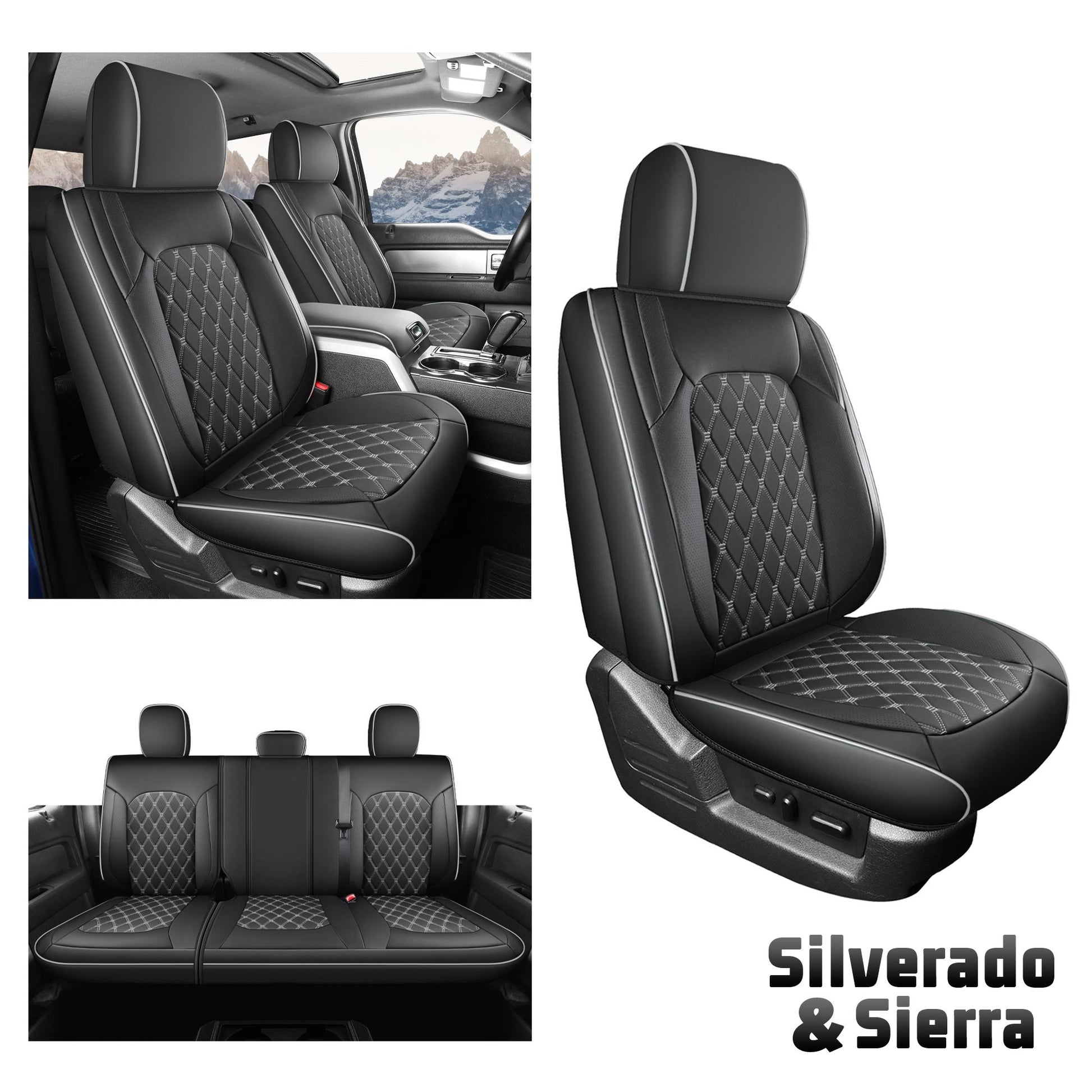 Precise Custom Fit Seat Covers: 3D scanning and precision cutting ensure a perfect fit for 2007-2013&2019-2024 Chevy Silverado & GMC Sierra 1500, as well as 2020-2024 2500HD & 3500HD models in Crew, Double, and Extended Cab configurations. The rear seat cover is designed exclusively for 60/40 split benches (not compatible with solid bench seats). The package includes covers for front seats, center console, rear seats, and headrests.